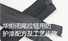 现有拉链,其金属链牙的耐磨、抗氧化、防锈、耐腐蚀性能有待改进,影响拉链的长期使用。 华炬新产品研究所技术咨询委员会科研人员现推荐一项一种闭尾拉链用防护漆配方及工艺步骤,该技术的优点和有益效果在于:提供一种闭尾拉链,其金属链牙涂覆有防护漆,使金属链牙具有优异的耐磨、抗氧化、防锈、耐腐蚀性能,从而保证拉链能长期使用,“防护漆”的性能和用途是由其组分及配比所决定的,且“防护漆”中的不同组分会相互影响,组分及其配比会决定“防护漆”的最终性能,如果组分及其配比不相互协调,单个组分所带来的有益效果,会被其他组分消减甚至消除,严重的时候,不同组分相互抵触,起不到整体综合作用,产生负作用和次品。该技术通过大量创造性劳动、反复验证,得到“防护漆”的最优组分及配比,使得多个组分综合在一起、相互协调、并产生正向综合效应现将该一种闭尾拉链用防护漆配方及工艺步骤及技术方案及实施例介绍如下供研究交流参考:(711611 473637)