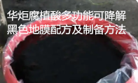华炬科技新产品研究所技术咨询委员会科研人员现推荐一项一种腐植酸多功能可降解黑色地膜配方及制备方法,该技术具有以下优点:1、采用大量廉价的褐煤、风化煤等为主要原料,大大降低了可降解地膜的生产成本、提高了地膜的吸热性能,合理的利用了低值煤资源。2、采用褐煤、淀粉可腐化分解为腐殖酸彻底解决了地膜对土地和环境污染的同时又增加了积农药、肥料和农膜于一身的特点。3、该地膜不仅具有一般生物和光降解功能,而且还可根据不同的生物生长需要,通过调整成膜剂和农药、除草剂、微肥的种类和含量获得适合不同作物的粉状可降解黑色地膜。4、液态地膜制作过程简单,用粉碎设备即可生产,稳定期长。5、该地膜为粉状,便于运输。6、用热水融化搅匀后,兑水现场喷施造膜,省工省时,操作简单。7、农作物或草出苗时,不用人工放苗,可自然出苗,节省了大量的人力和物力,现将该一种腐植酸多功能可降解黑色地膜配方及制备方法及技术方案及实施例介绍如下供研究交流参考:(211611 233763)