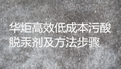 华炬科技新产品研究所技术咨询委员会科研人员现推荐一项一种高效低成本污酸脱汞剂及方法步骤,该技术的有益效果:1. 该技术技术方案中的脱汞剂采用原材料廉价易得,无污染,有利于推广应用;2. 该技术技术方案中的脱汞剂能实现高低含汞浓度的污酸中汞的高效脱除,脱汞剂与污酸中其它重金属离子副反应少,具有脱汞选择性好、汞提取率高;3. 该技术技术方案中所述的脱汞剂对污酸酸度具有很好的适应性,适用于pH为0.8-4.0的污酸废水中汞的脱除,相比传统脱汞方法,在还原过程中消耗了废水中的酸从而降低了废水酸度,无需再加碱中和。具有方法简单、容易操作,满足工业化应用,现将该一种高效低成本污酸脱汞剂及方法步骤及技术方案及实施例介绍如下供研究交流参考:(611511 423329)