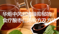 华炬科技新产品研究所技术咨询委员会科研人员现推荐一项一种用于中风后烦躁抑郁的食疗酸枣仁汤验方及方法,该技术由一味蔬菜与酸枣仁组合煮汤,具有清心安神、交通心肾,涩精止血的功效。可用于中风后痰热未清,虚烦惊悸,失眠多梦等,现将该一种用于中风后烦躁抑郁的食疗酸枣仁汤验方及方法及技术方案及实施例介绍如下供研究交流参考:(411211 165603)