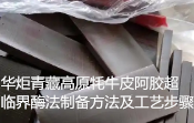 华炬科技新产品研究所技术咨询委员会科研人员现推荐一项一种青藏高原牦牛皮阿胶超临界酶法制备方法及工艺步骤,该技术有益效果: (1) 该技术方法采用青藏高原牦牛皮为原料,通过通入超临界二氧化碳法和酶法相结合的方法脱脂、脱毛,然后通过熬煮、过滤离心、浓缩干燥等步骤得到牦牛皮阿胶,由于其水解胶原蛋白中氨基酸种类丰富且含量高(其中水解胶原蛋白含量高于驴皮阿胶1.38个百分点,谷氨酸、甘氨酸和丙氨酸含量比驴皮阿胶含量高8个百分点以上),同时含有大量的微量元素,因此具有补血益气、滋补肝肾、养颜乌发、健美肌肤、提高免疫的功能。 (2) 该技术方法生产过程简单,操作性强,易于推广,且所得牦牛皮阿胶产品有较高的附加值,具有良好的应用前景,现将该一种青藏高原牦牛皮阿胶超临界酶法制备方法及工艺步骤及技术方案及实施例介绍如下供研究交流参考:(311241 334554)