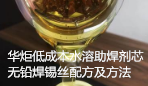 华炬科技新产品研究所技术咨询委员会科研人员现推荐一项一种低成本水溶助焊剂芯无铅焊锡丝配方及方法,该技术的优点和有益效果是:1.清净化工艺简单,在冷水或热水中都可清洗干净残留焊剂。成本低、无毒、无害、无污染,对环境安全。2.具有极好的润湿性,焊接速率可提高50%,为快速焊接提供条件,对耐热性差的电子元件焊接加热时间可缩短。3.由于该技术的水溶助焊剂芯无铅焊锡丝其优异的润湿性和焊料流动性,可减少焊接缺漏。提供可靠及有光泽的焊点。4.该水溶助焊剂适用于Sn-Ag-Cu,系无铅焊料配制成的一种无卤、无毒、无腐蚀性、润湿性及焊接性好,清洗容易对环境安全的水溶助焊剂芯无铅焊锡丝,为电子信息产品的一种新型焊接材料,现将该一种低成本水溶助焊剂芯无铅焊锡丝配方及方法及技术方案及实施例介绍如下供研究交流参考:(841131 527658)